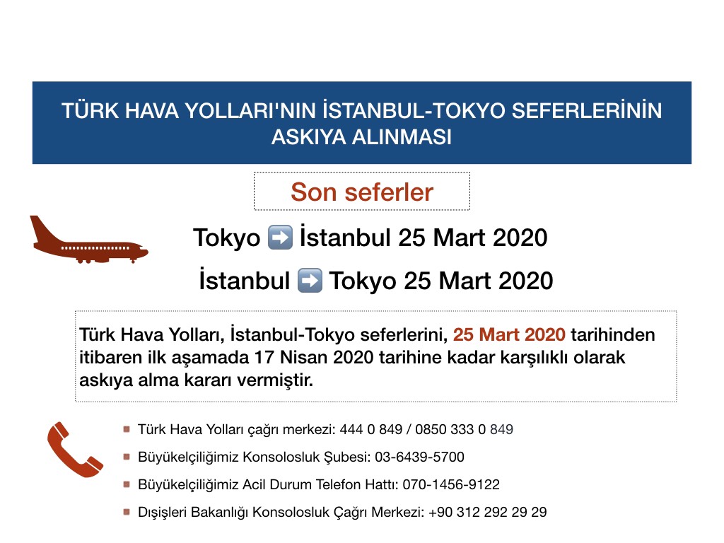 Türk Hava Yolları, İstanbul-Tokyo seferlerini 25 Mart 2020 tarihinden itibaren ilk aşamada 17 Nisan 2020 tarihine kadar karşılıklı olarak askıya alma kararı vermiştir.
